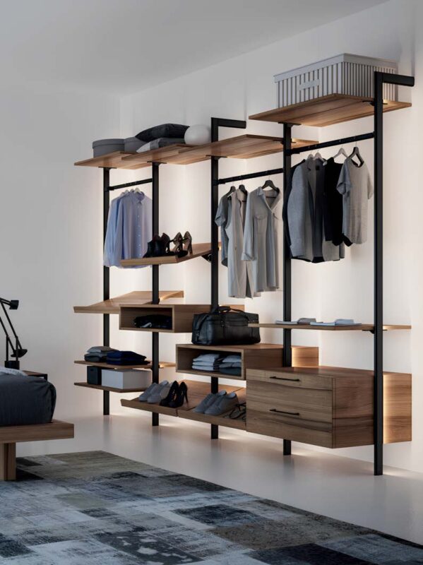 This wardrobe system offers endless possibilities for space design, allowing for lightand elegant constructions. Regardless of yourneeds, you can use shelves made of glass,particle board, MDF, or any other panelmaterial.